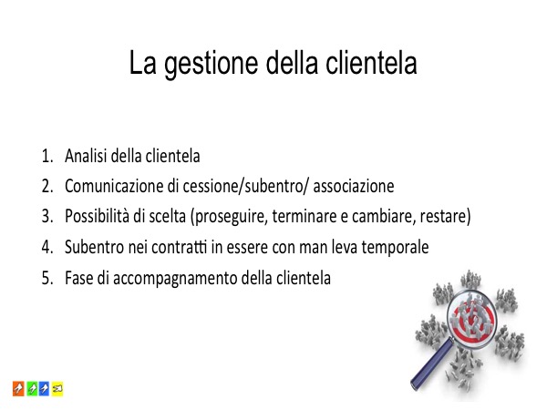 Il "passaggio" della clientela è un attività che il medico dovrà espletare per favorire al meglio il subentro del nuovo professionista e la prosecuzione delle terapie in atto. Il professionista che sta per lasciare l'attività dovrà condividere questo percorso attraverso la sua presenza quotidiana in studio che andrà a ridursi nel tempo ma che permetterà il passaggio "senza traumi" del paziente da un medico ad un altro, cercando di spiegare le motivazioni che hanno portato alla modifica della struttura organizzativa dello studio.