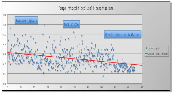 Si tratta di un'analisi retrospettiva che prevede di intervenire su un dataset di dati aggiornati dagli operatori dello studio dentistico nell'esercizio delle normali mansioni quotidiane. Lo scopo della raccolta è trovare una correlazione tra il tempo di lavorazione clinico (ritocchi occlusali e cementazione) e la tecnologia produttiva utilizzata per la realizzazione del manufatto. Sono state raccolte le indicazioni riguardanti 532 corone singole prodotte dallo studio.