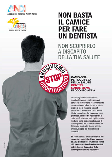 "Per sensibilizzarli che la cura odontoiatria è un atto medico", ci dice Gianfranco Prada presidente nazionale ANDI. "Spesso il dentista è visto come colui che risolve un problema, il dolore, il dente che manca, e non il professionista che come il medico lo cura e lavora per mantenere sano il proprio corpo. La campagna servirà a spiegare questo, a spiegare che chi si finge dentista commette un reato; che non esiste un finto dentista che "lavora bene" così come un finto cardiologo non può fare una corretta diagnosi; che non è vero che dall'abusivo si risparmia. Inoltre cercheremo di sfruttare l'attenzione dei media per ribadire che coloro che si affidano ad un finto dentista non devono pagarlo, chiedere i danni e denunciarlo. ANDI continuerà a supportarli in queste azioni legali, come da sempre fa".