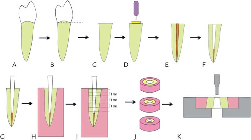 Preparazione dei campioni per il test di push-out. A, dente premolare mandibolare. B, Decoronazione a livello della giuntura amelo - cementizia. C, dente Decoronato. D, Trattamento endodontico. E, otturazione canalare . F, preparazione dell'alloggiamento del perno in fibra. G, procedura di cementazione dei perni. H, i campioni incorporati in resina acrilica. I, dischi dentina, dello spessore di 1 mm. J, dischi di dentina coronale, medio apicale. K, apparecchiatura per il test di Push-out per misurare l'adesione dentina/cemento del perno .