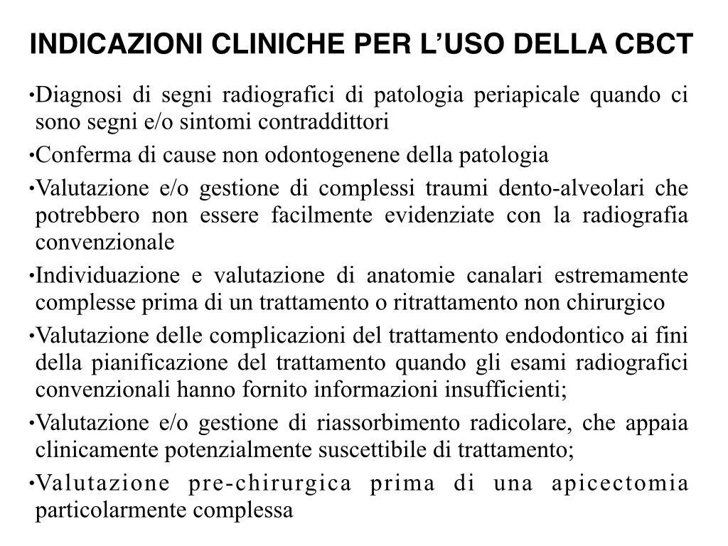 Le limitazioni della radiologia tradizionale in Endodonzia, sia essa su pelicola o digitale, sono ad oggi ben conosciute, a cominciare dalla natura bidimensionale di questi esami diagnostici. La CBCT sembra poter superare alcune di queste limitazioni generando immagini tridimensionali delle zone di interesse. In questo momento ci sono più di 40 diversi macchinari sul mercato che differiscono tra loro per diversi aspetti, in particolare le specifiche tecniche, i criteri di esposizione, il dosaggio effettivo e la qualità delle immagini. Viene anche sottolineato come la richiesta di una scansione CBCT deve essere considerata solo se le informazioni supplementari ottenibili da queste immagini tridimensionali possano potenzialmente aiutare il clinico a formulare una diagnosi corretta o ad incrementare le possibilità di cura di un dente con un problema endodontico.