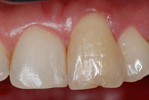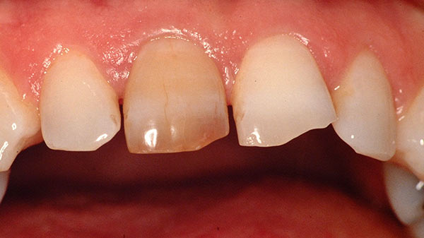 -Trauma dentale con necrosi della polpa può provocare discromia anormale attraverso differenti meccanismi patogenetici [1]: dentina reattiva: la reazione dell'organo della polpa dentale, dopo un evento traumatico dannoso, può provocare una cospicua deposizione di dentina di reazione per proteggere la polpa che solitamente rimane vitale. L'aumento di spessore della dentina provoca una perdita di trasparenza del dente con relativa discromia .