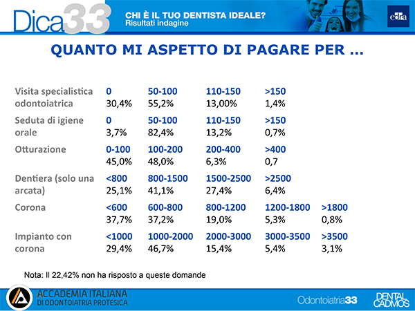 Per quanto emerge dall'indagine in oggetto per la maggioranza i costi attesi sono conformi alla situazione attuale, quello che manca è la percezione della parte intellettuale dell'opera dell'odontoiatra, cosa che traspare dalla percentuale di intervistati, che si attende la prima visita gratuita."