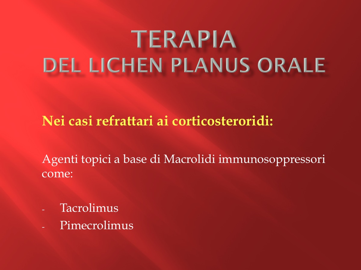 I corticosteroidi topici rimangono la scelta terapeutica primaria . Tuttavia, i benefici terapeutici di questi farmaci non sono sempre evidenti. Ci sono i dati consistenti su alternative possibili strategie terapeutiche che sono efficaci nei casi di OLP refrattaria agli steroidi.