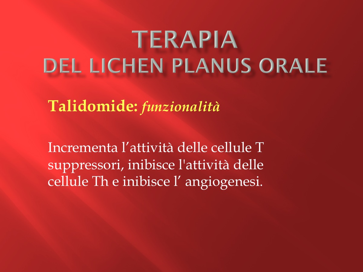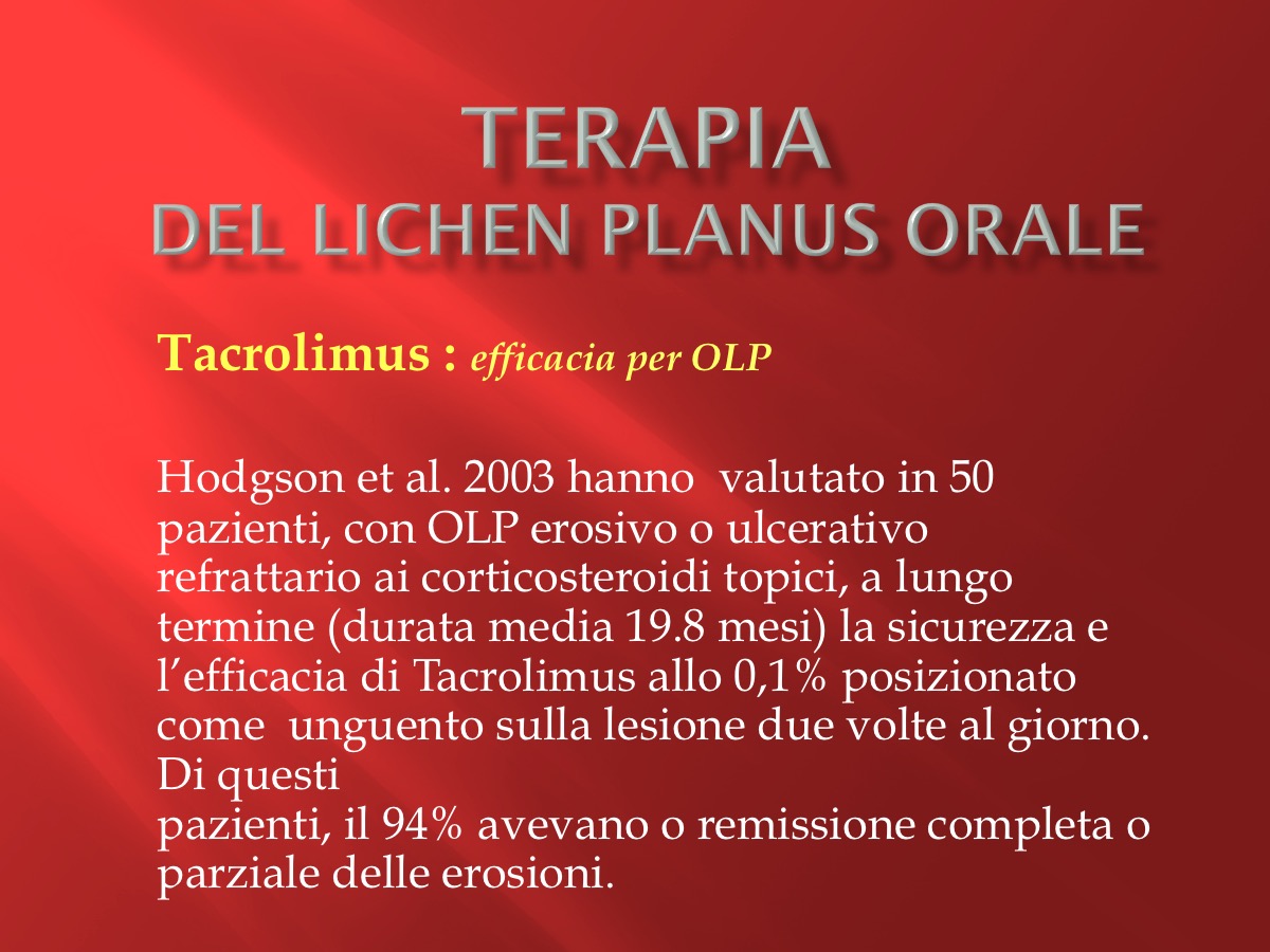In una recentissima revisione della letteratura pubblicata su Oral Surg Oral Med Oral Pathol Oral Radiol di maggio 2016 viene fornita una panoramica ( illustrata nello slide sottostante) degli attuali approcci per la gestione dell' OLP steroidi-refrattario, evidenziandone vantaggi, svantaggi ed effetti collaterali.