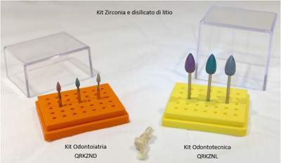 I Kit sono formati da tre frese (3 microfiamme per studio e tre fiamme per laboratorio) confezionate in un portafrese (base universale) in silicone autoclavabile con coperchio.